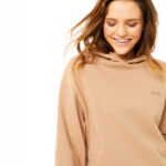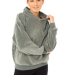 Hoodie Sweater mit weiten Schultern und Rippenbund. Kapuze ist gefüttert, hat Eingrifftaschen.