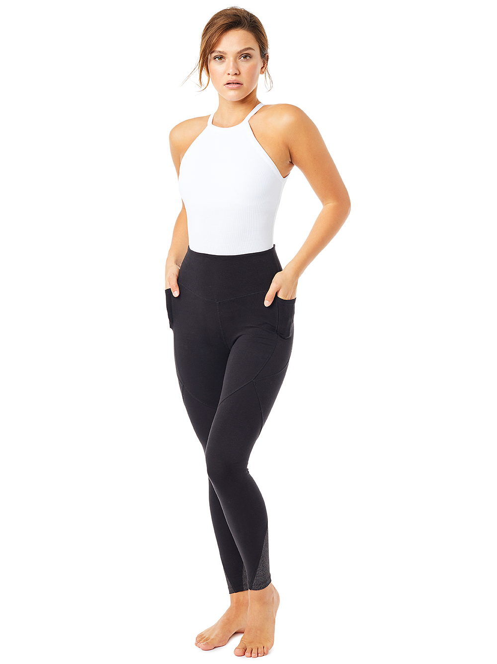 Schulterfreies Yoga Top aus weißer, elastischer Bio-Baumwollrippe. Bei 1,70m Größe geht die Länge bis zur Hüfte.